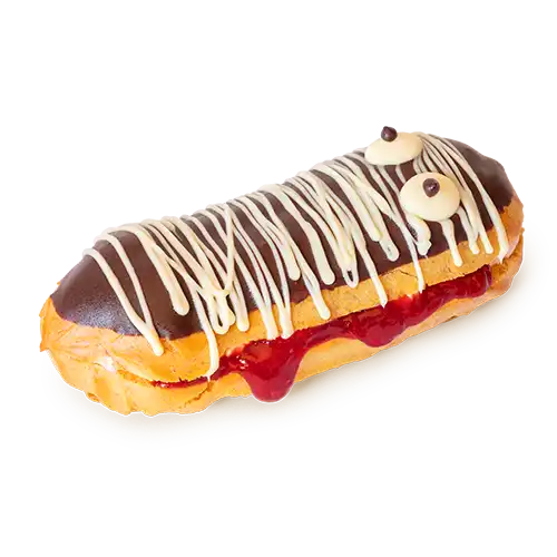 Massa Choux com recheio de morango e cobertura de chocolate negro e branco.